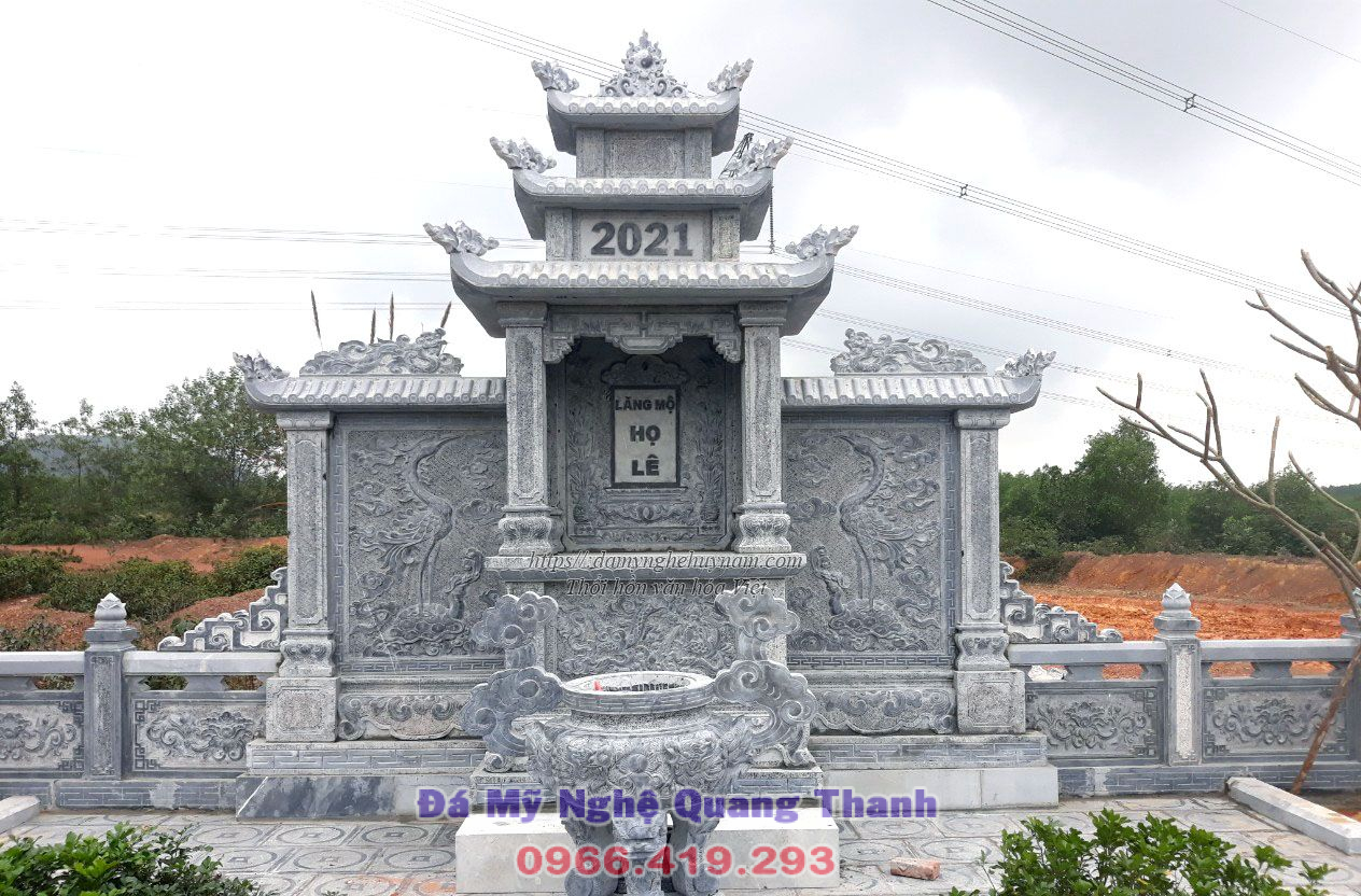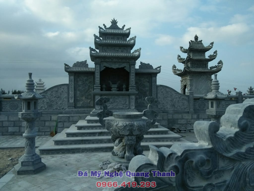 Mộ đá 3 mái được cơ sở Đá mỹ nghệ Quang Thanh – Ninh Bình được làm từ đá xanh đen còn nguyên khối. Chạm khắc các mẫu hoa văn đơn giản như hoa sen chữ thọ. Hoặc các biểu tượng cao quý như là rồng phượng. Tạo cho chúng ta cảm giác cao quý nhưng rất đỗi gần gũi.
